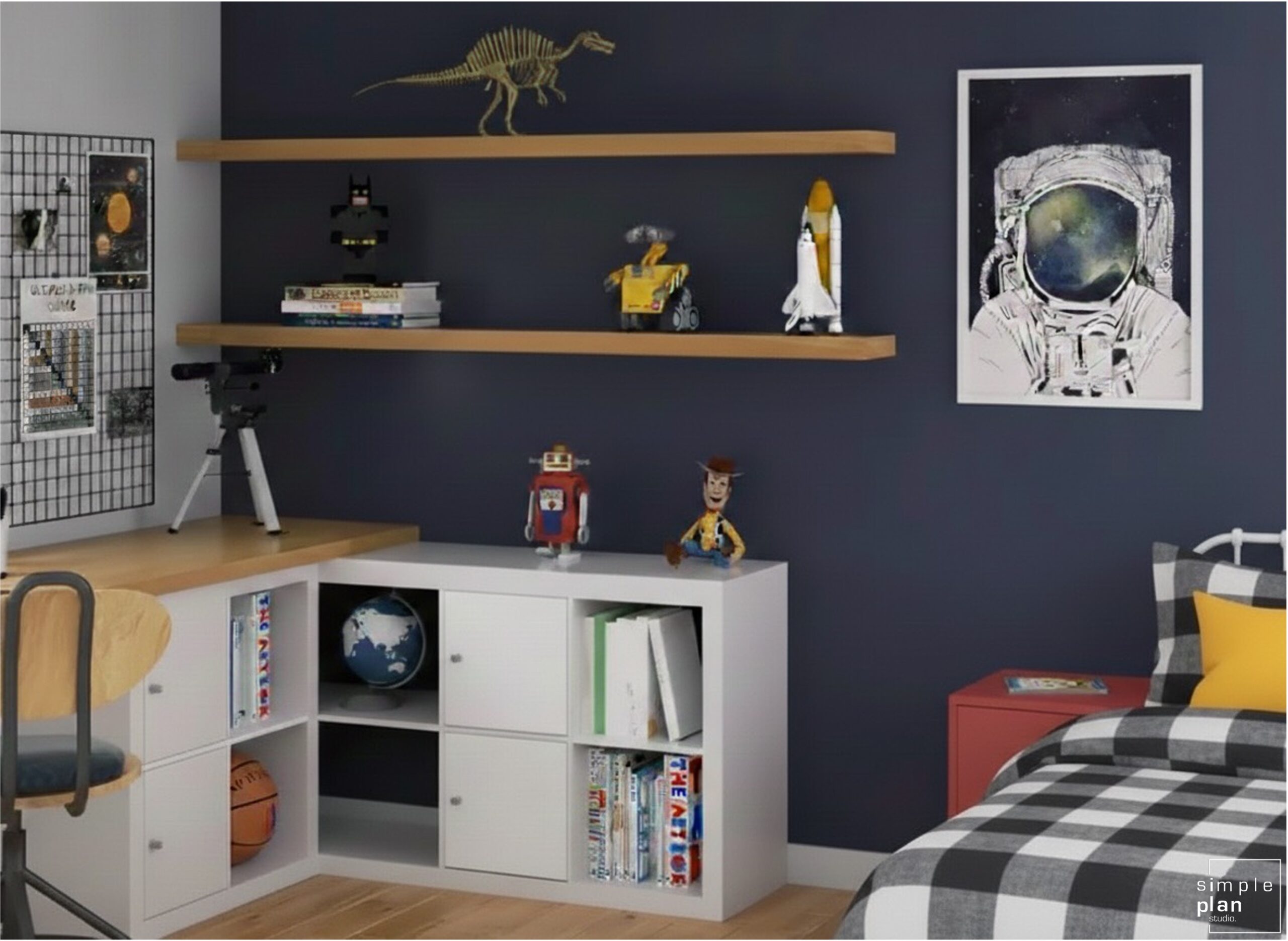 Philip’s room is a space designed to embrace multiple passions: from a love for LEGO and superheroes to a fascination with dinosaurs and the Great Universe. The focal point is a multifunctional desk that serves both as a study area and a dedicated base for building complex models. The color palette features deep navy walls contrasted with white furniture and warm wood, while vibrant red and yellow accents bring dynamic energy to the room.